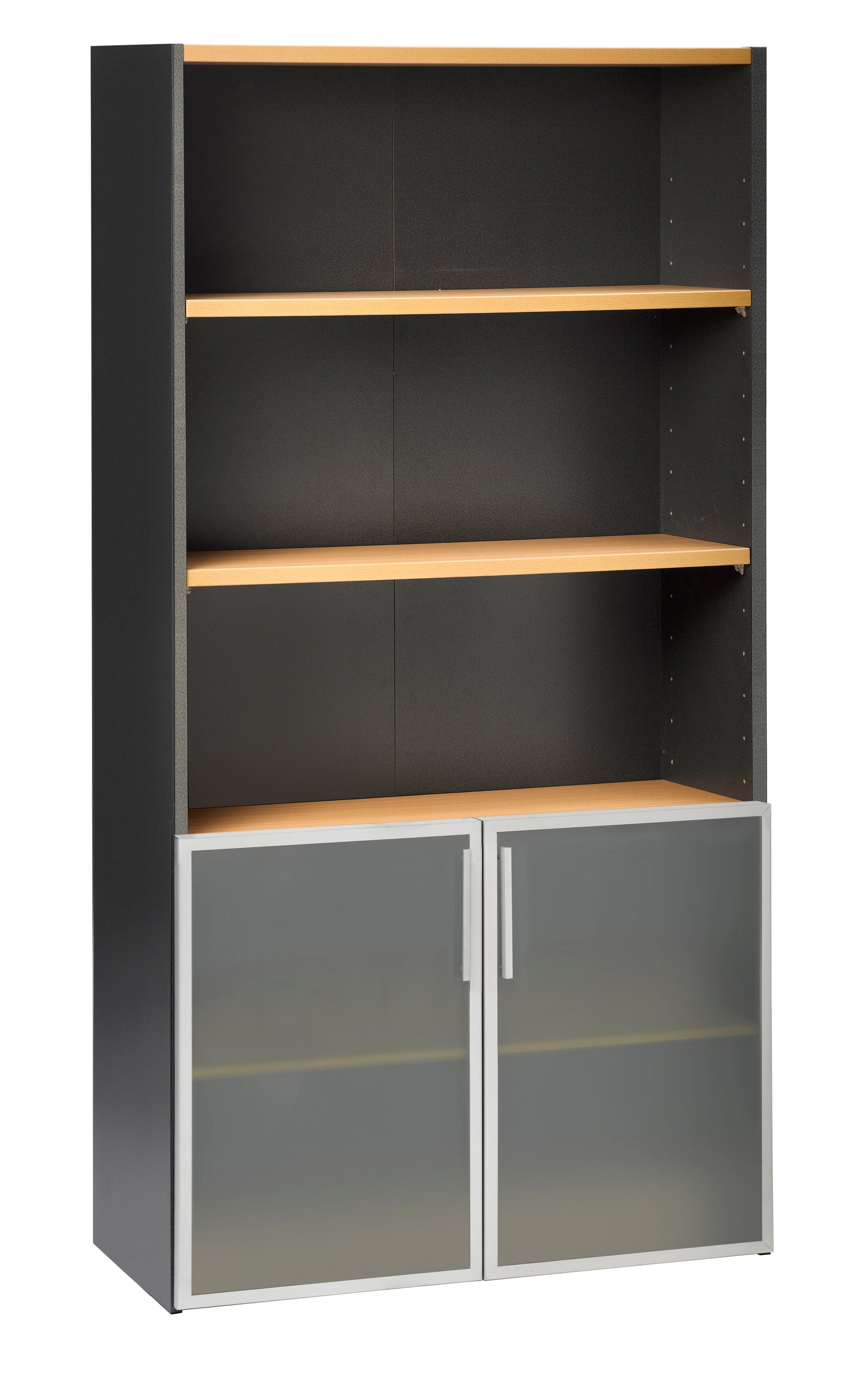 EMERGE OFFICE STORAGE CUPBOARD IRONSTONE FRAME WITH BEECH SHELVES AND 2 HALF HEIGHT GLASS DOORS COVERING THE TWO LOWER SHELVES