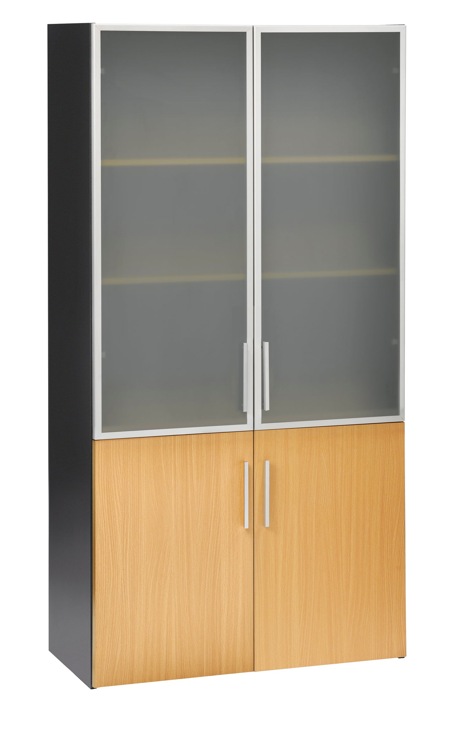 EMERGE OFFICE STORAGE CUPBOARD IRONSTONE FRAME WITH BEECH WOODEN DOORS OVER TWO LOWER SHELVES AND GLASS DOORS OVER THE TOP THREE SHELVES